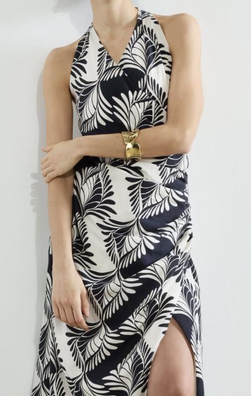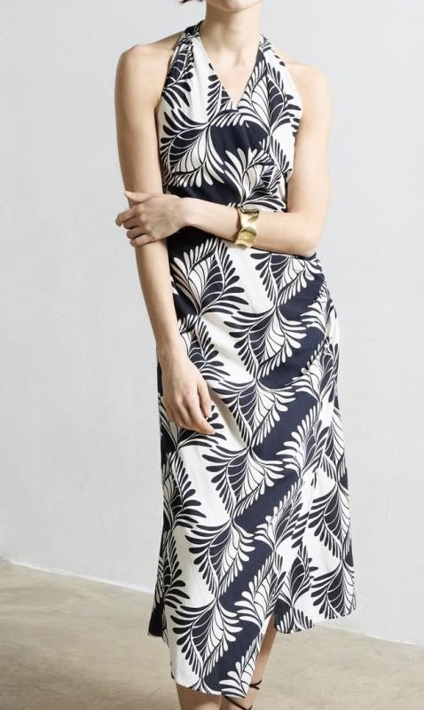 Helfodrad halterneck klänning i blommönster i svart o kräm.