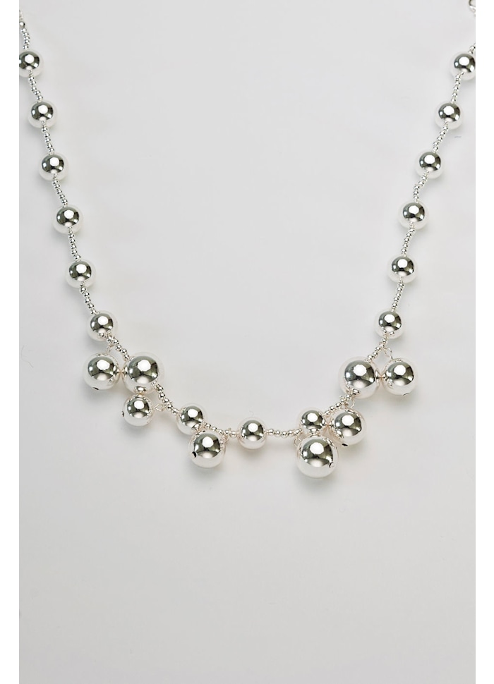 Silverfärgad halsband med hängande pärlor i olika storlekar.