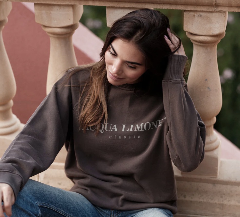 Mörkbrun college med citron på ryggen och text fram på bröstet.
