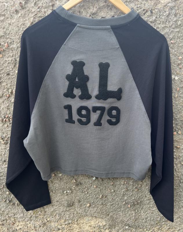 Svart broderad Acqua Limone text fram på bröstet. Svart flossad text på ryggen "AL 1979" Då märket grundades.