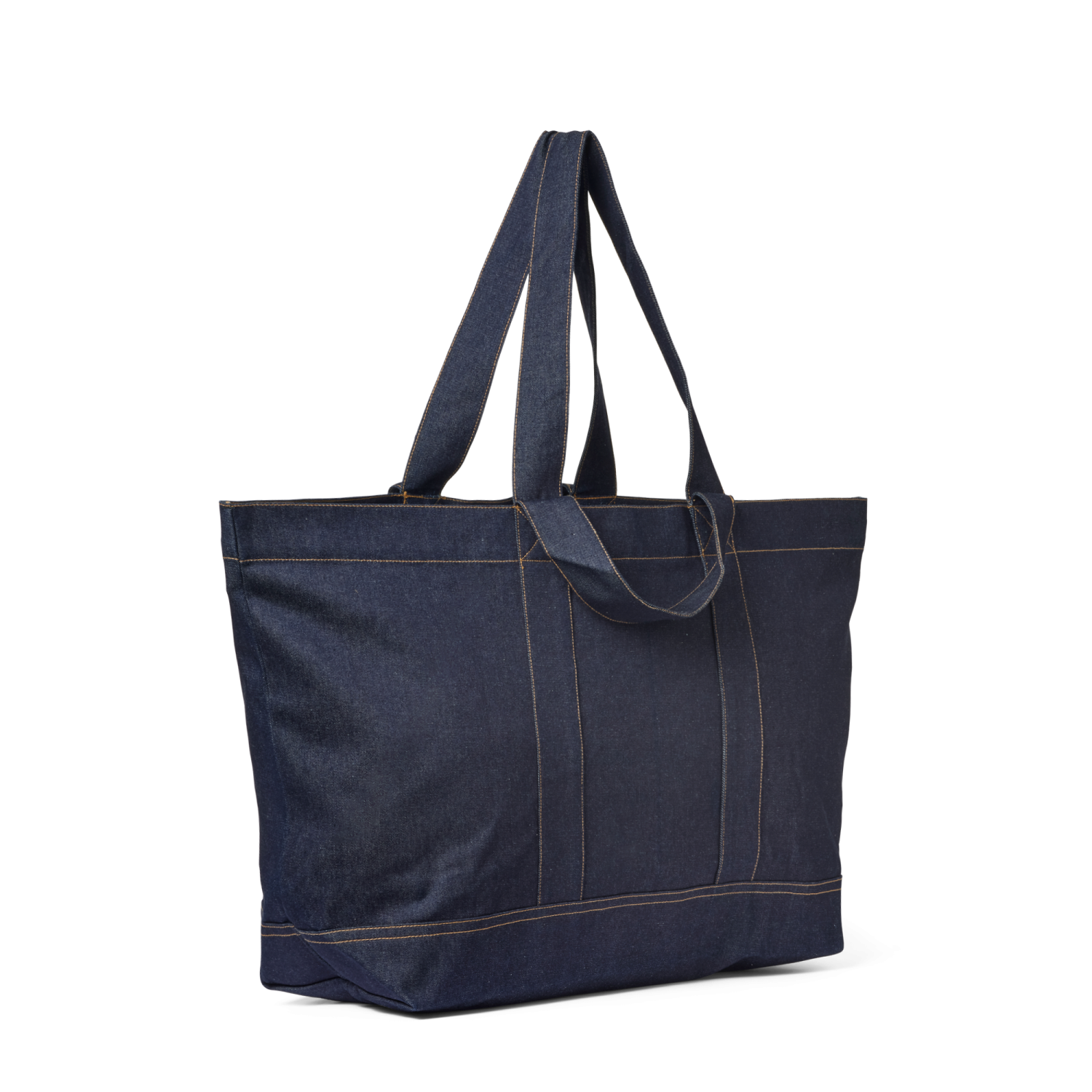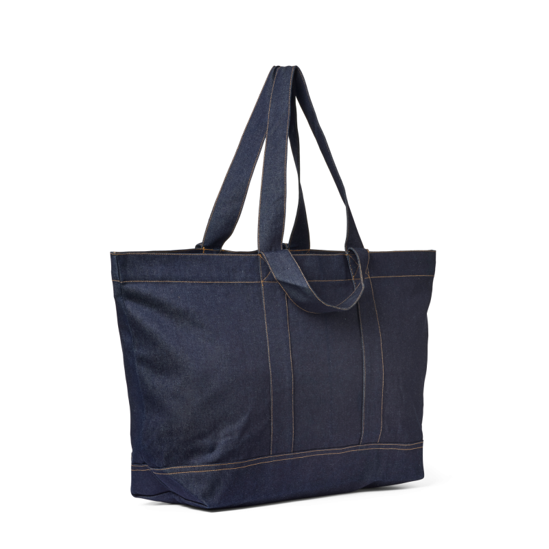 Rymlig väska i mörkblå jeanstyg med orange sömmar.