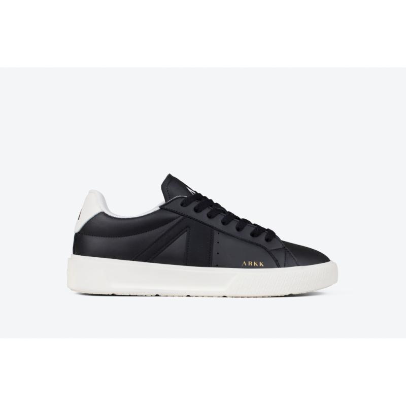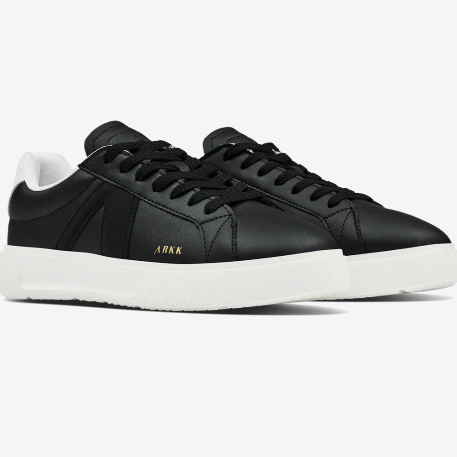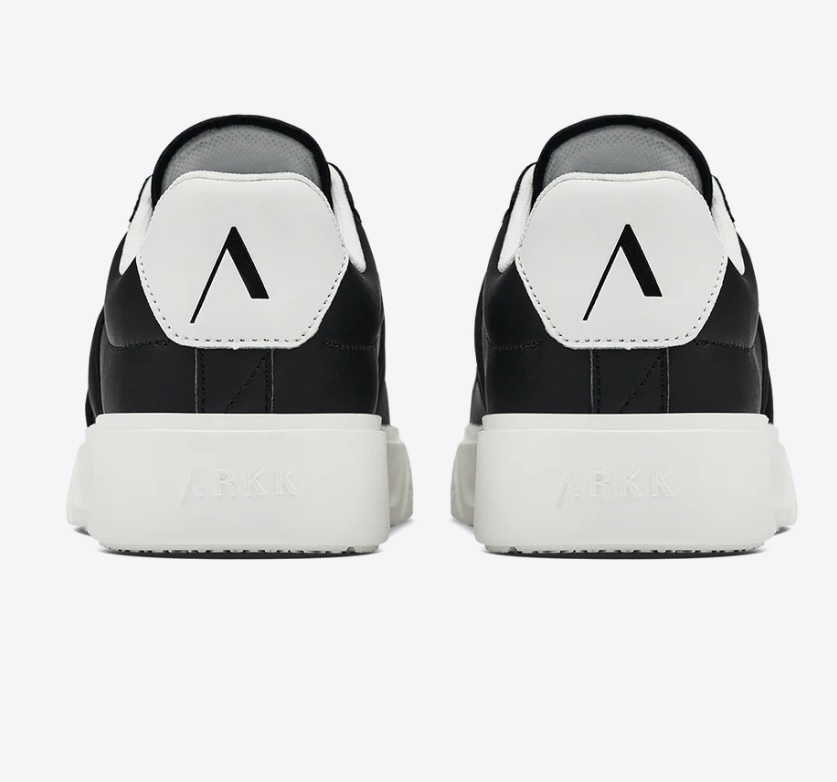 Svart sneaker med vit sula och med vitt parti bak på hälen.