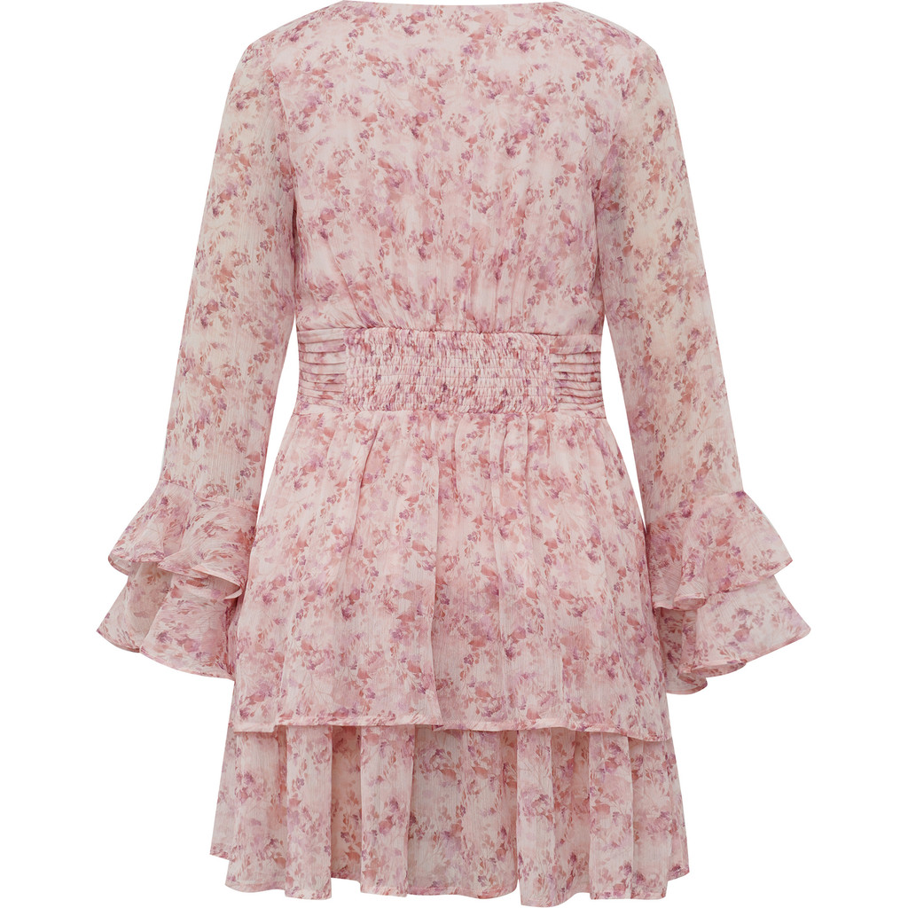 Rosa klänning i blommigt mönster som slutar strax ovanför knät och med volanger nertill.