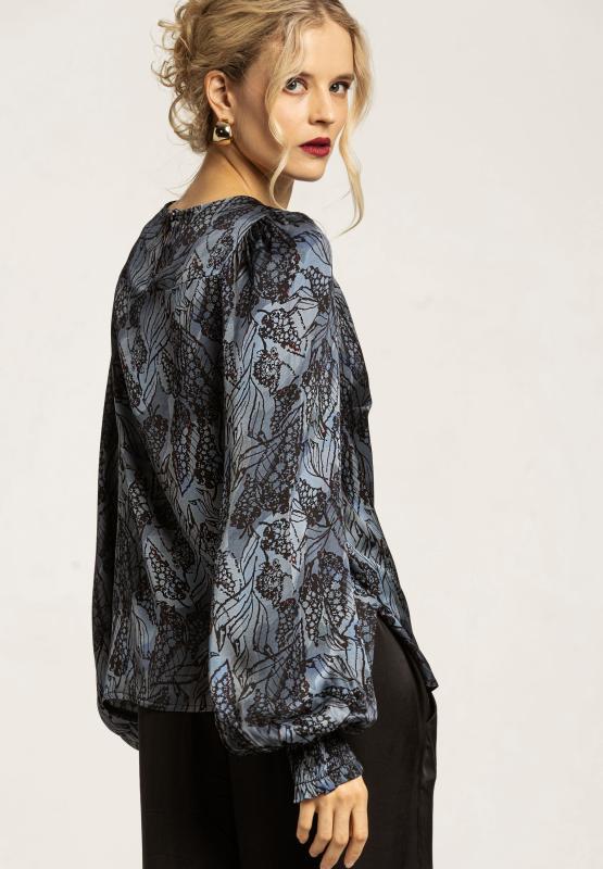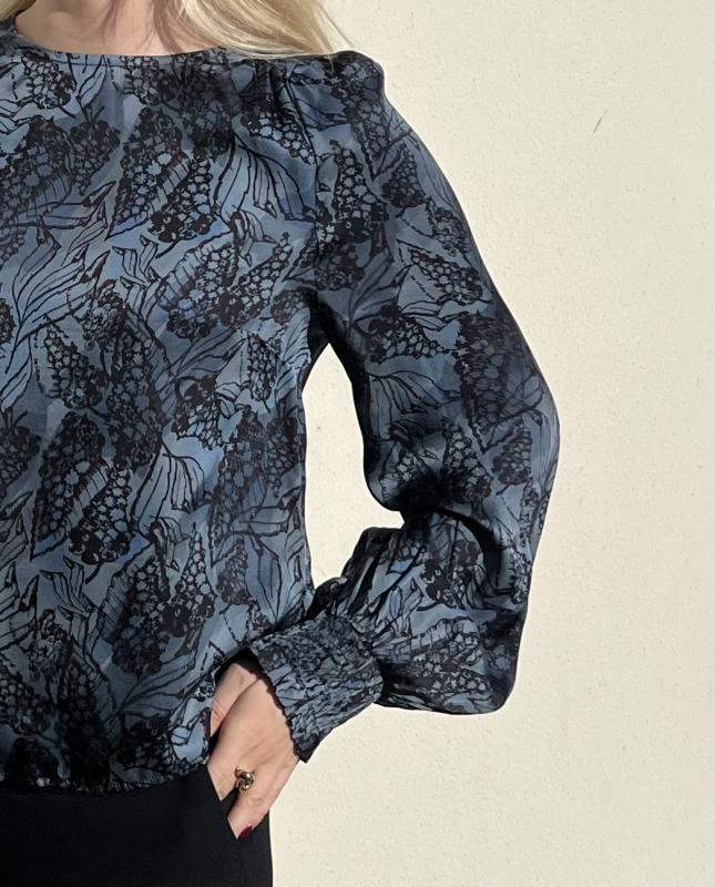 Petrolblå/svart mönstrad glansig blus med lång ärm som avslutas med resårmanschetter.