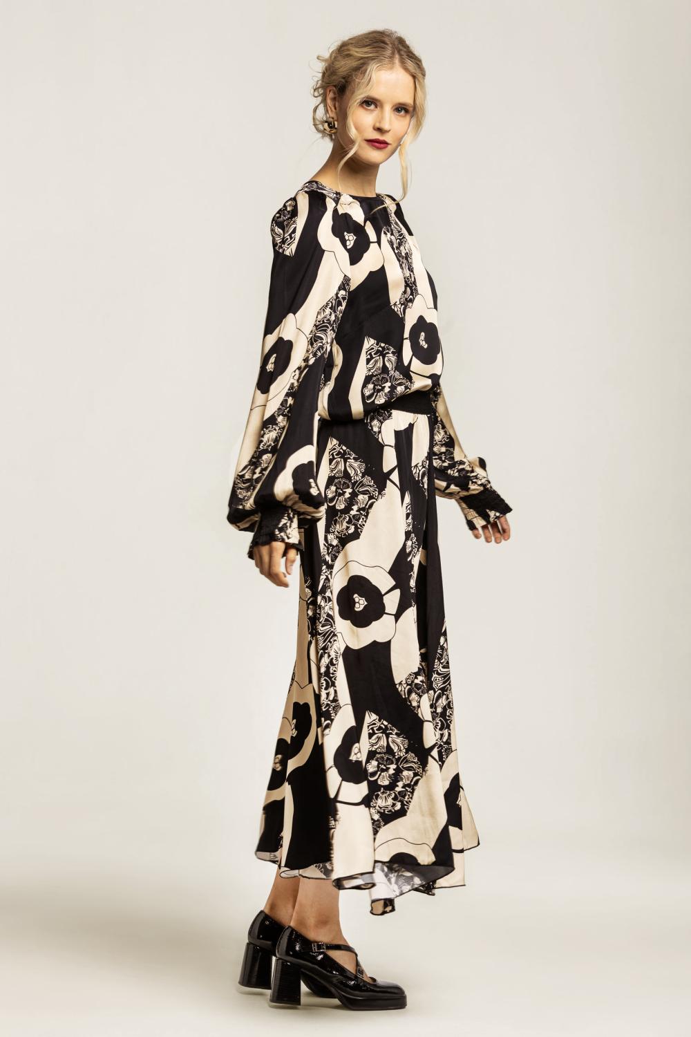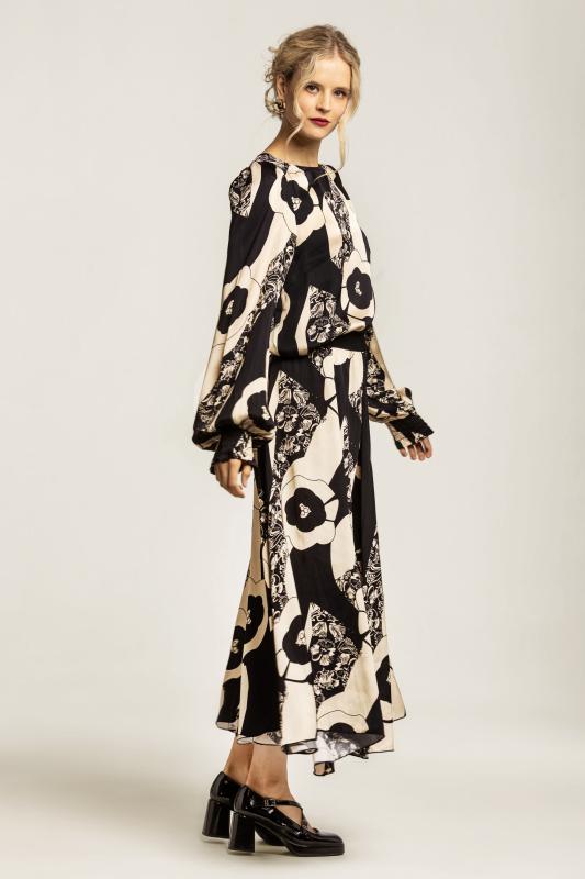 Svart/offwhite mönstrad glansig blus med lång ärm som avslutas med resårmanschetter.