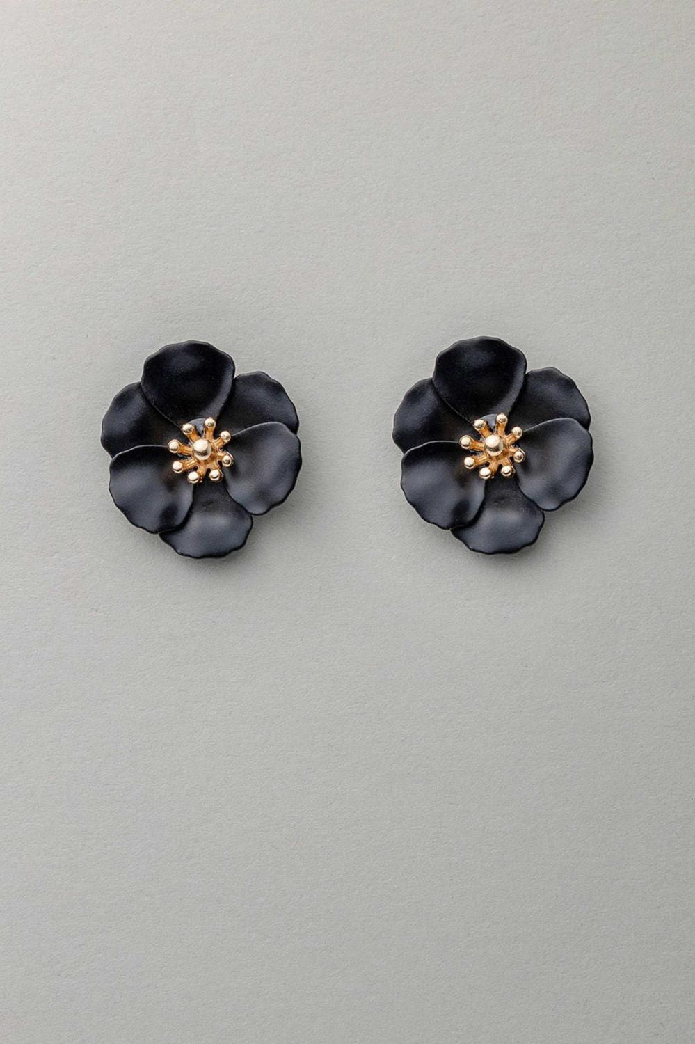 Svarta glansiga blomörhängen med guldiga pistiller.