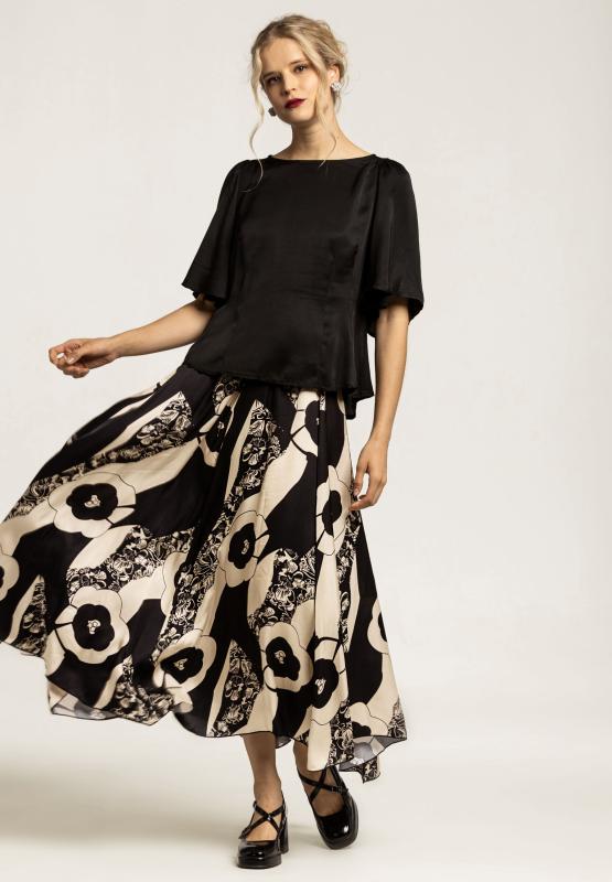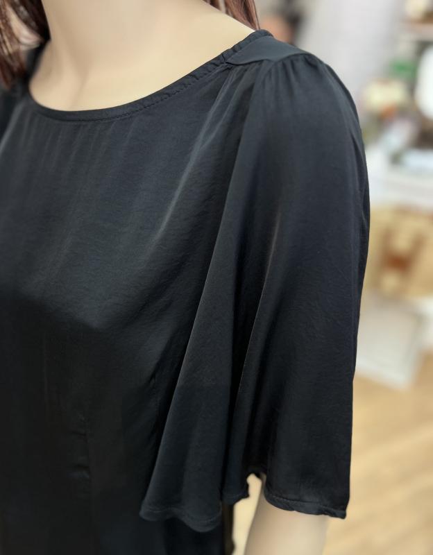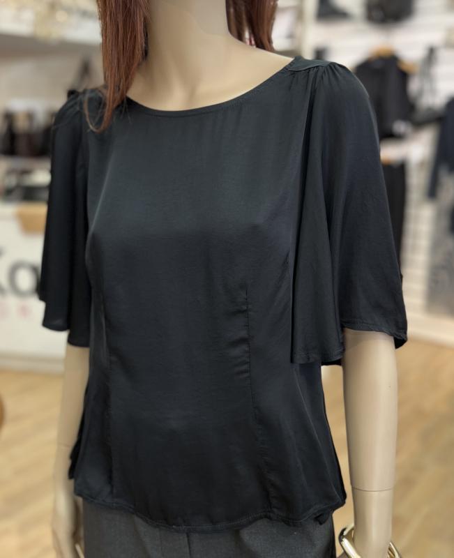 Svart glansig blus med vid kort ärm och rynkor vid axeln.