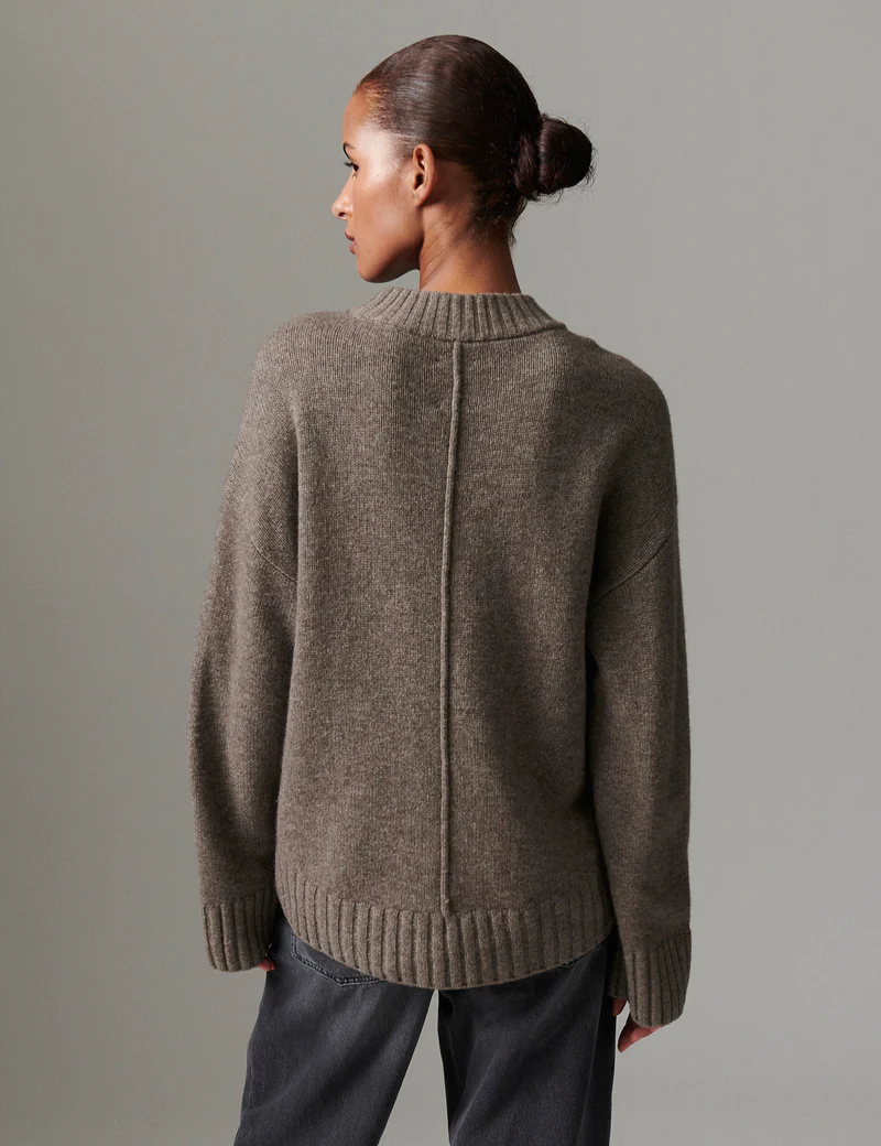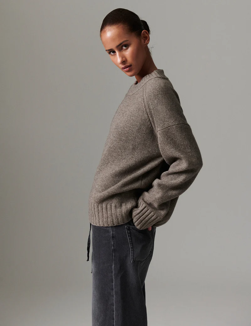 Ljusbrun stickad tröja i rak modell med rund hals.
