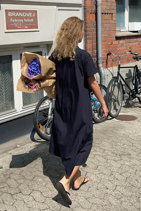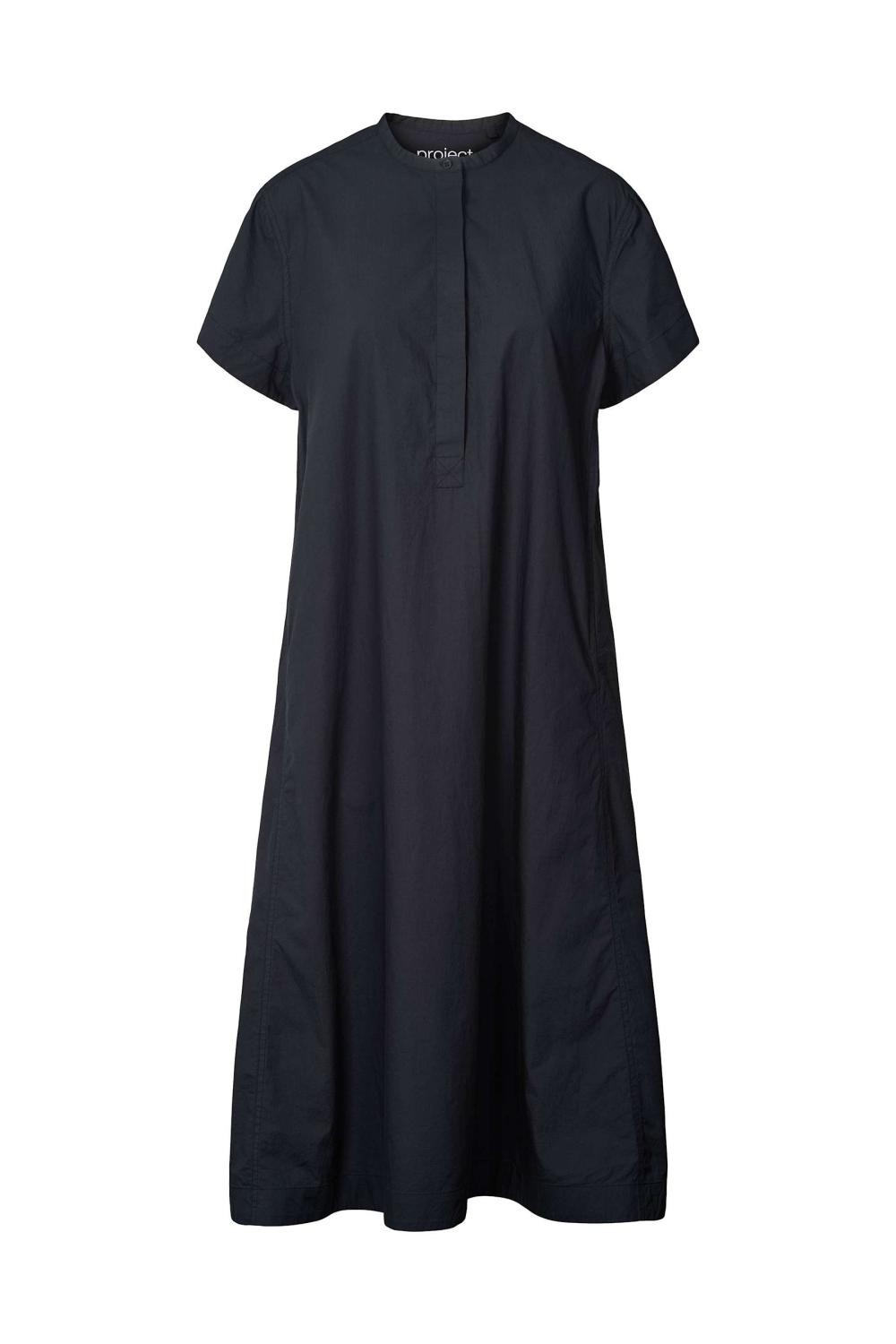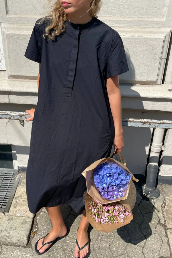 Vadlång svart skjortklänning i avslappnad passform med kort ärm.
