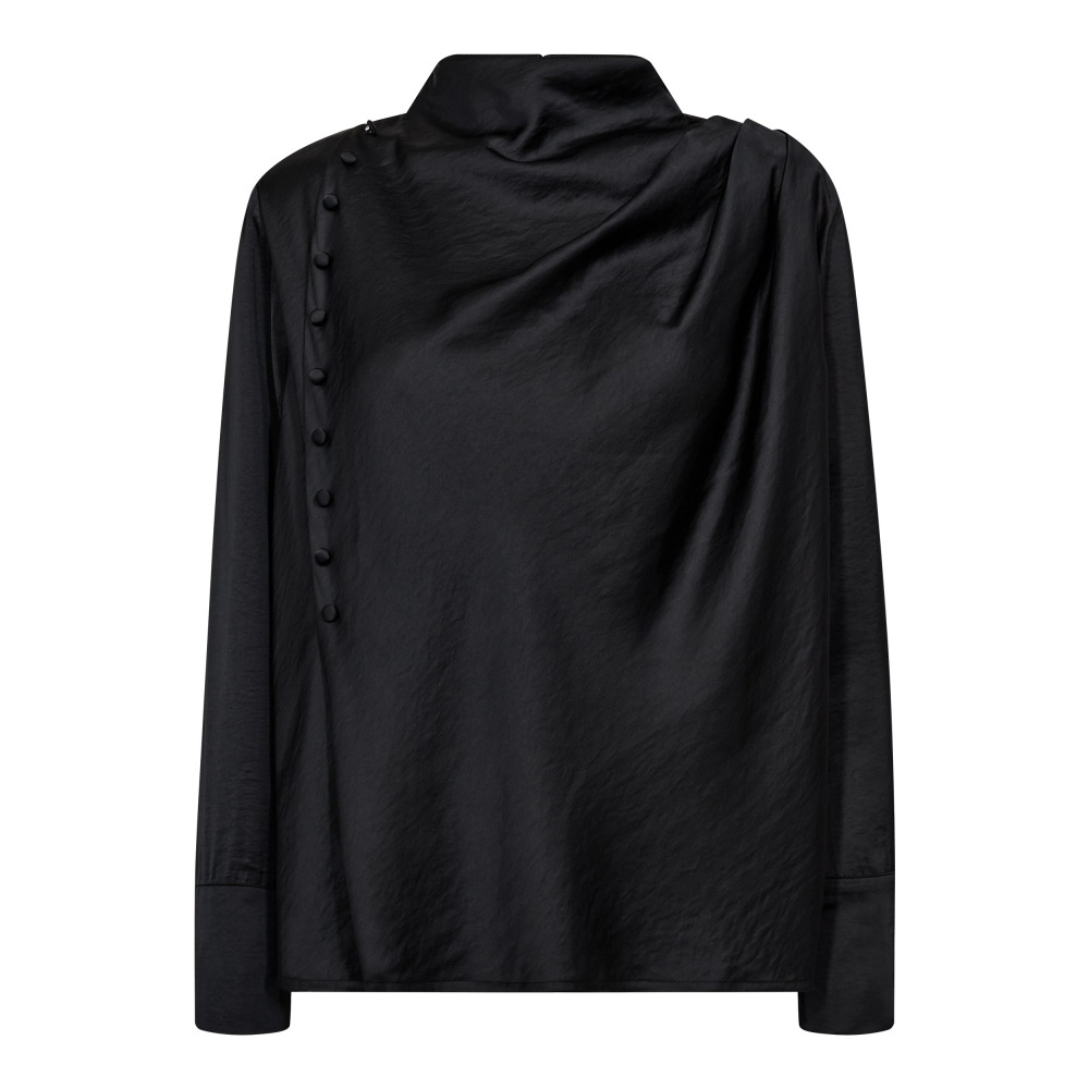 Svart glansig blus med drapering vid högra axeln och knappar på vänstra sidan.