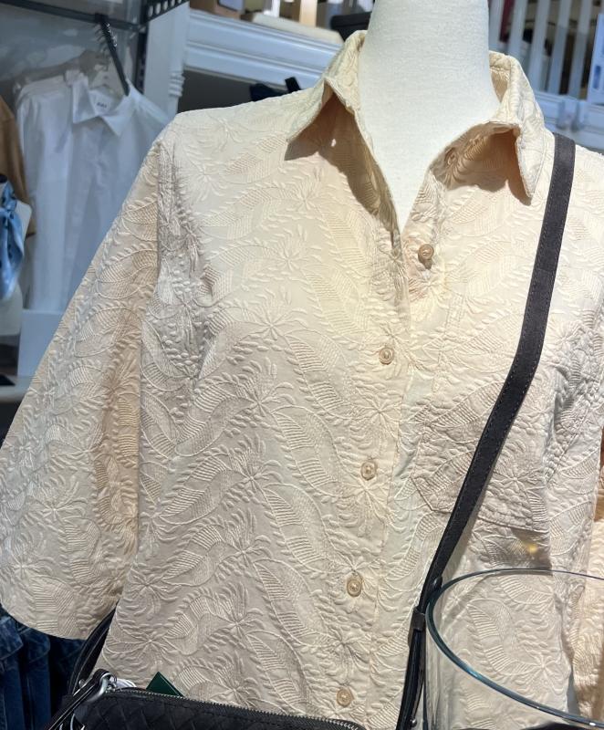 Sandfärgad kraftig skjorta med blommigt broderat mönster och vid kort ärm.