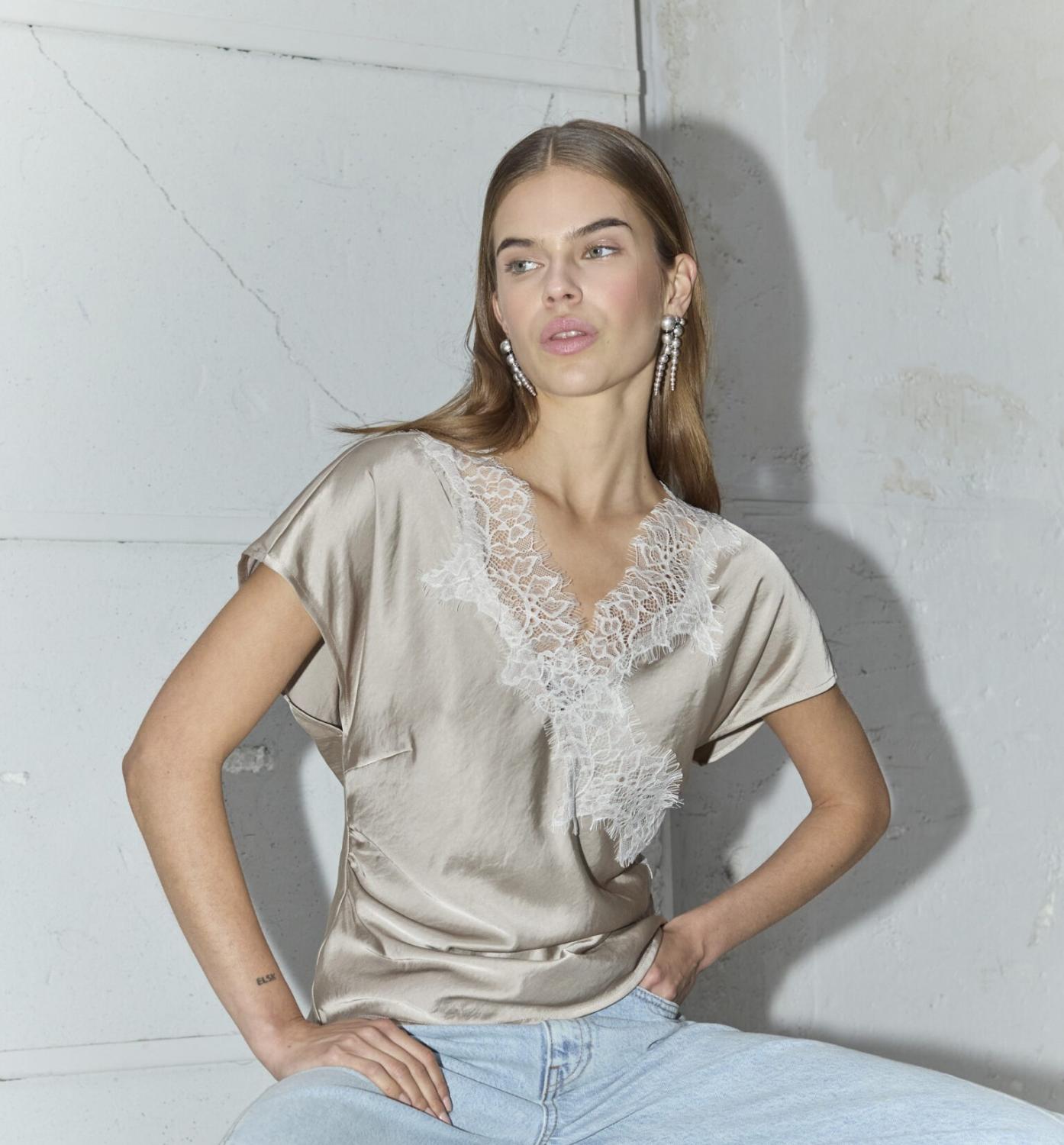 Champagnefärgad blus i glansigt material med vita spetskanter runt ringningen.