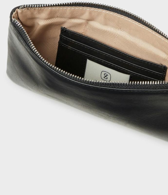 Smidig och stilren svart plånbok, designad för att passa perfekt i större väskor – men lika fin att bära för sig själv. Den fungerar både som plånbok och mini-necessär och rymmer enkelt mobil, kort, läppglans, glasögon och andra småsaker du vill ha nära till hands. Tillverkad i mjukt full grain koläder av hög kvalitet, certifierat av Leather Working Group. Det naturliga lädret åldras vackert och får mer karaktär ju mer du använder det. Insidan är fodrad i slitstark polyester och har ett öppet fack samt tre kortfack för enkel organisering. I fodret finns även ett skyddande RFID-membran som skyddar dina kort mot obehörig avläsning. Plånboken stängs med en metalldragkedja och har detaljer i blank nickelfärgad metall. En mångsidig och tidlös accessoar – perfekt som liten läderpouch, plånbok eller mini-necessär för vardag och resa.