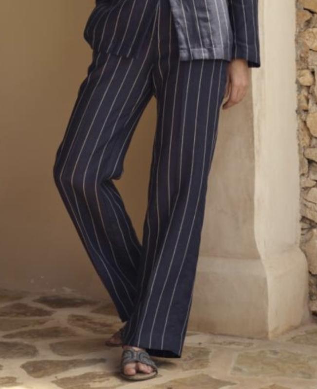 Randig marinblå linnebyxa med sandfärgade ränder, raka vida ben.