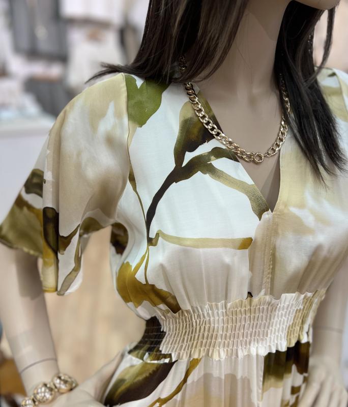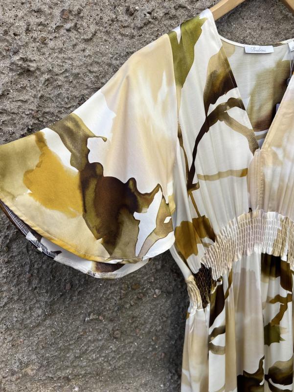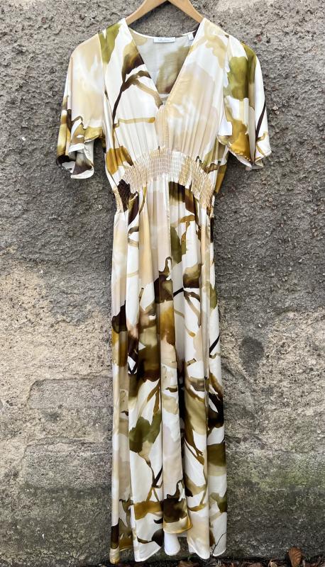 Ankellång krämfärgad klänning med mönster i bruna och gröna toner.