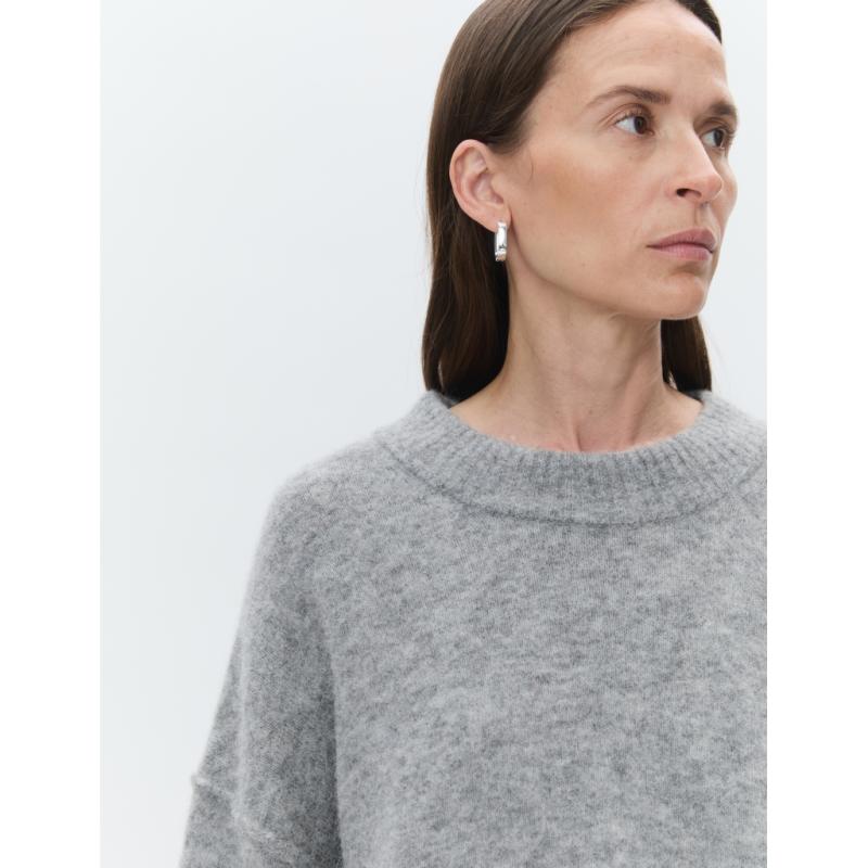 Grå melerad stickad tröja med rund hals, rak modell med sprund i sidorna.