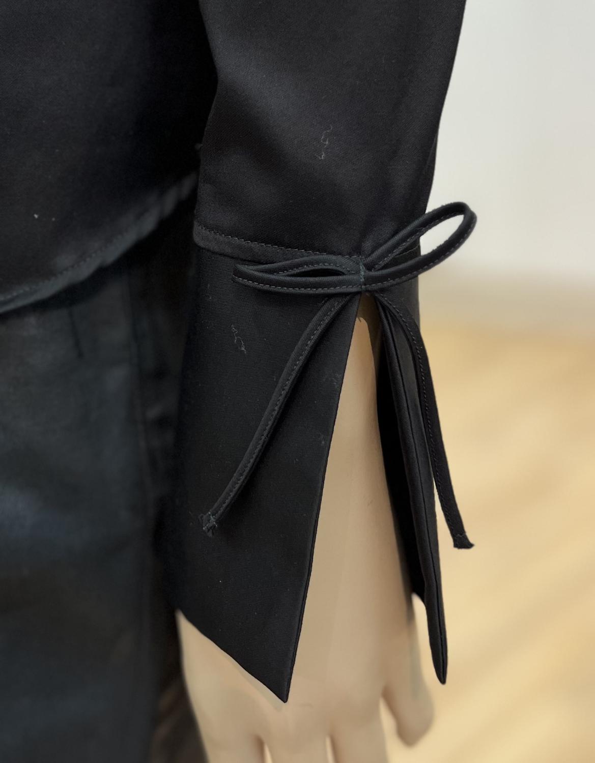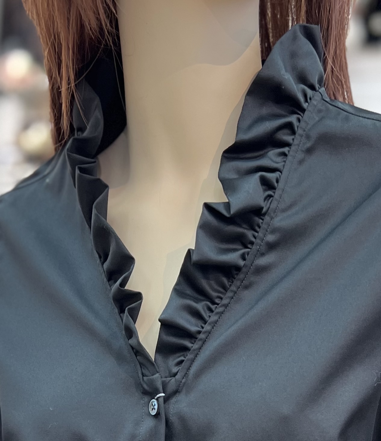 Svart satinvävd skjorta med volang runt den v-ringade halsringningen.