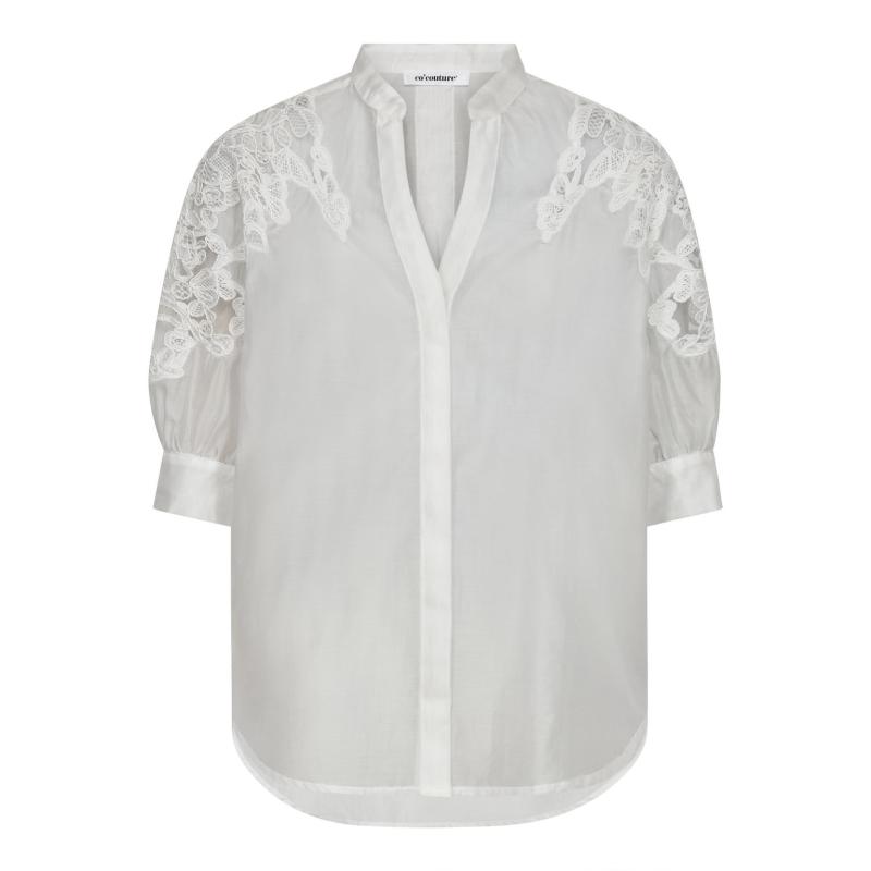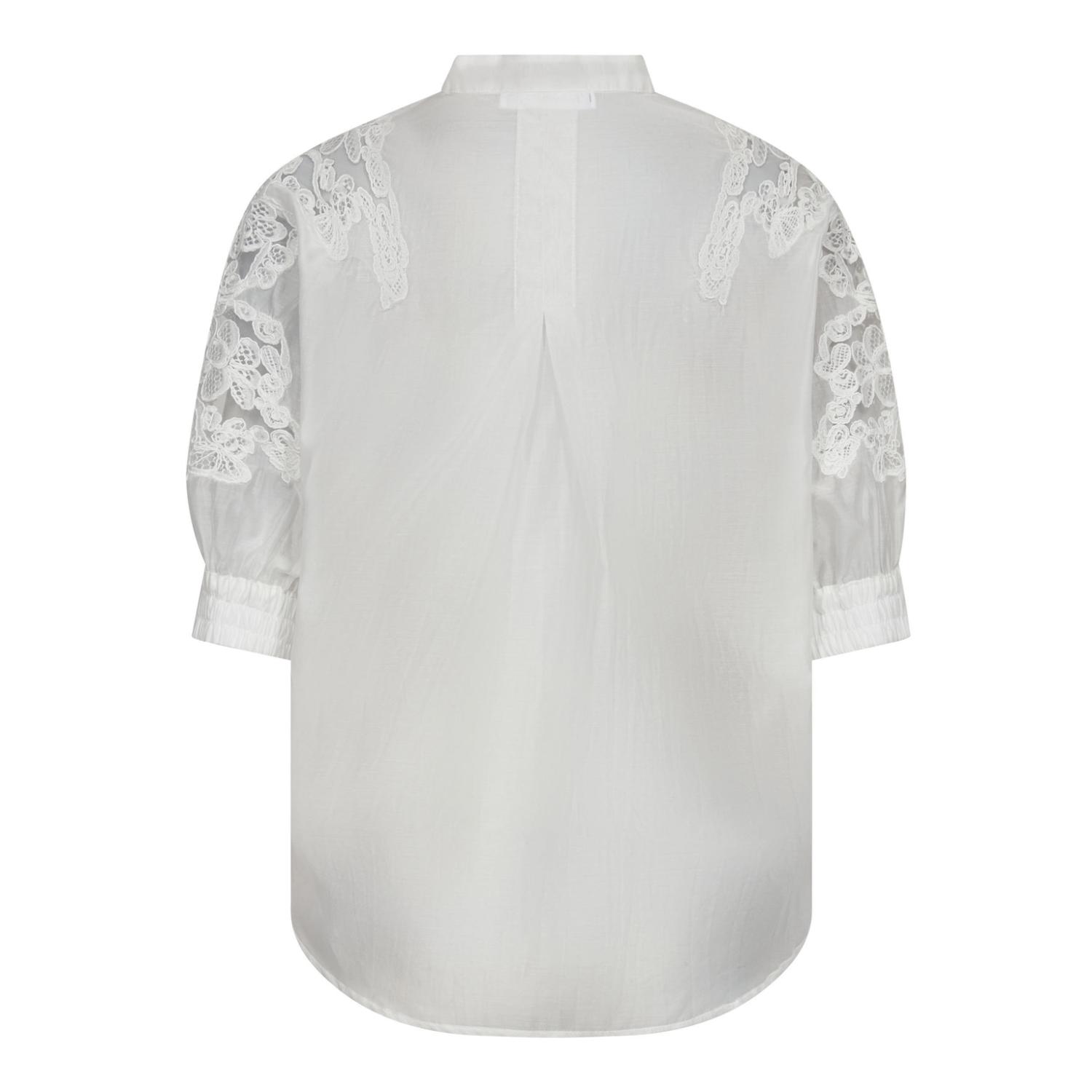 Skir vit kortärmad blus med spets på axlarna och ut över ärmarna.