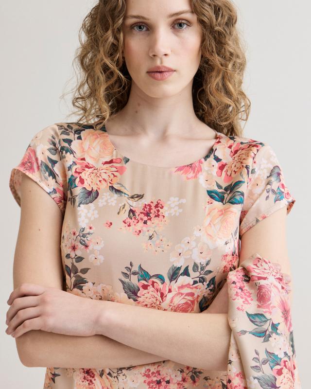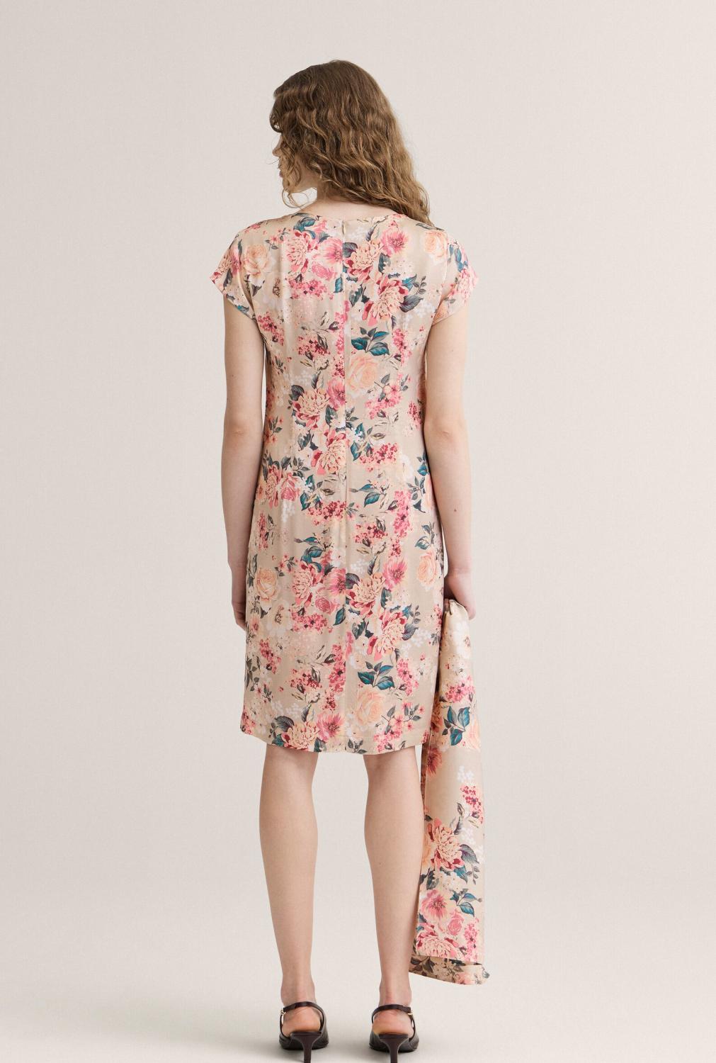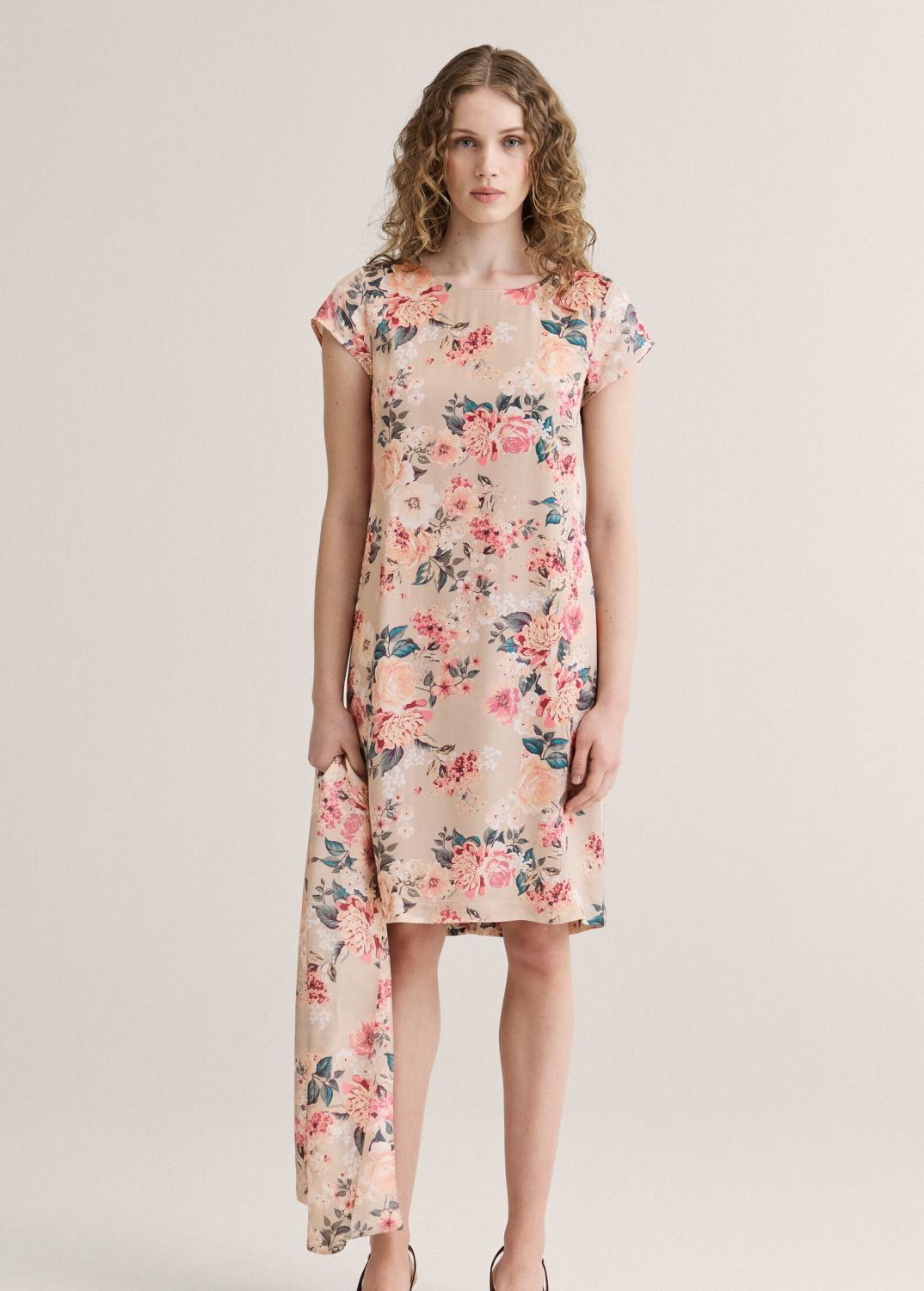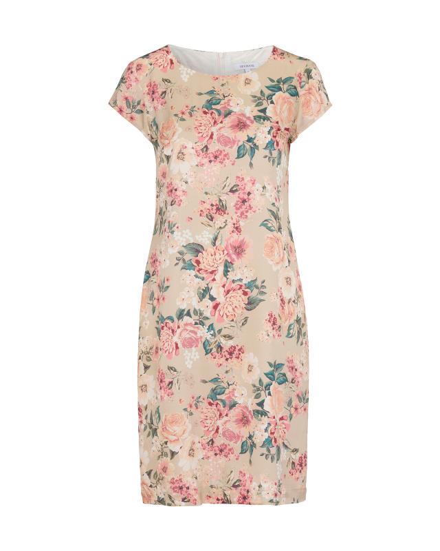 Rak klänning som slutar strax under knät med khakifärgad botten och blommigt mönster i rosa, grönt och beige.