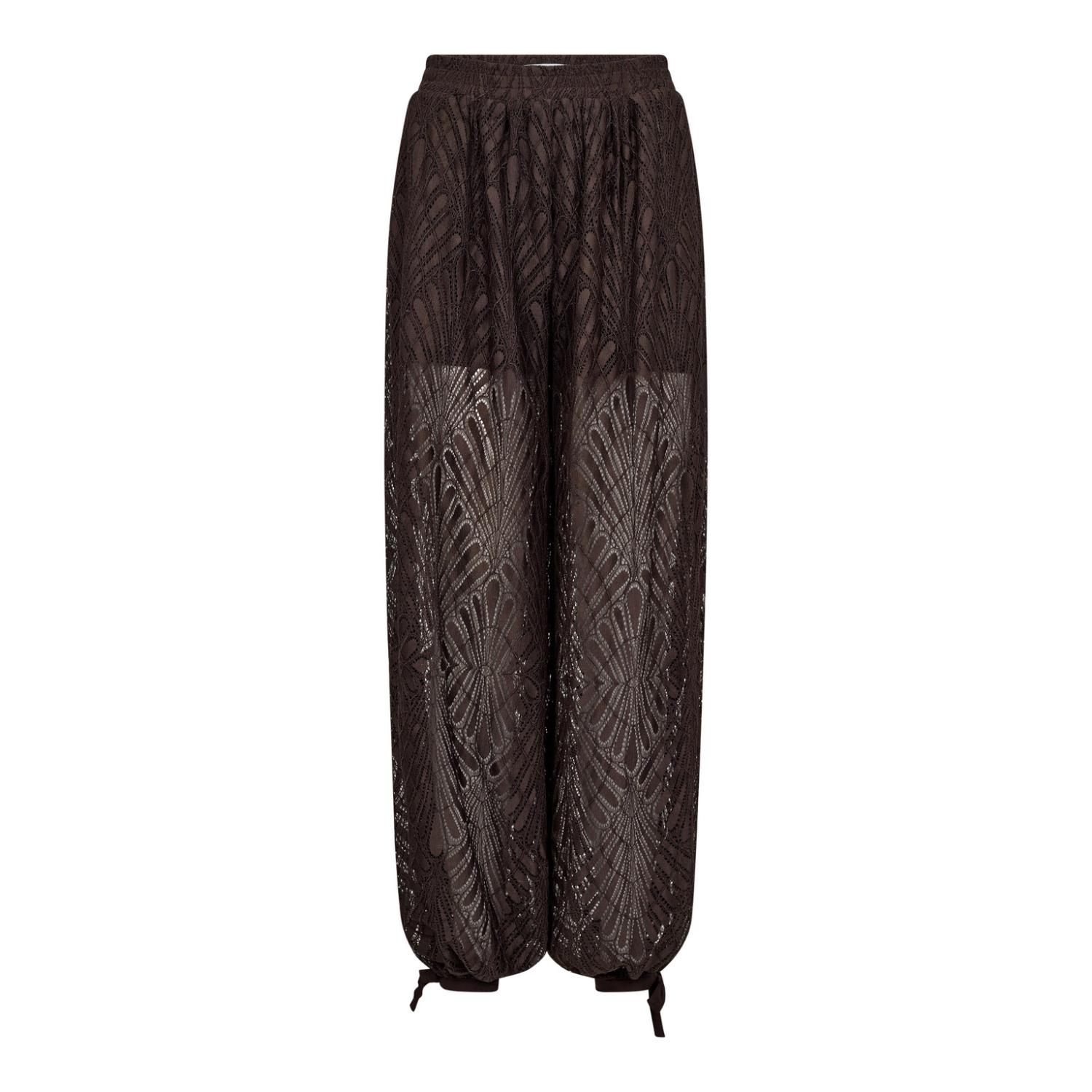 Mörkbruna geombrutna ballongbyxor i spets, fodrad ner till låret.