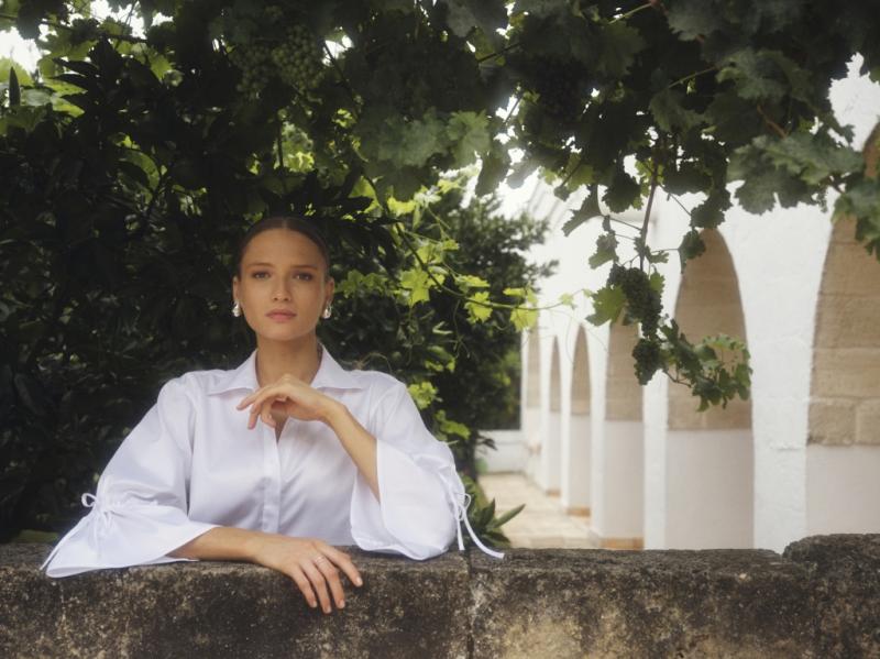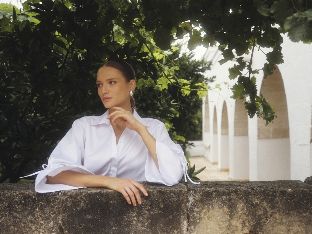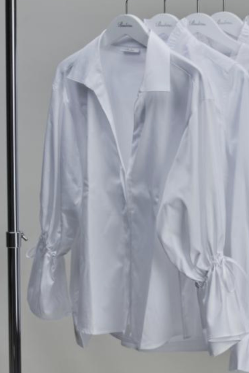 Vit blus/skjorta med krage och v-ringad halsringning, volang vid ärmslut som dras åt med dragsko med knyt.