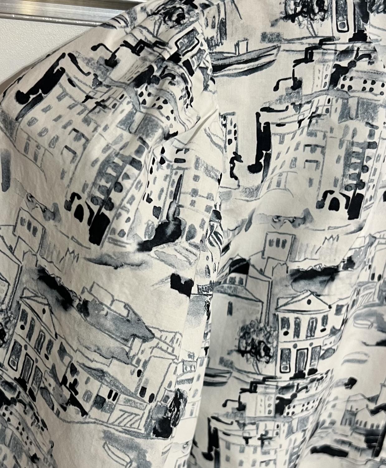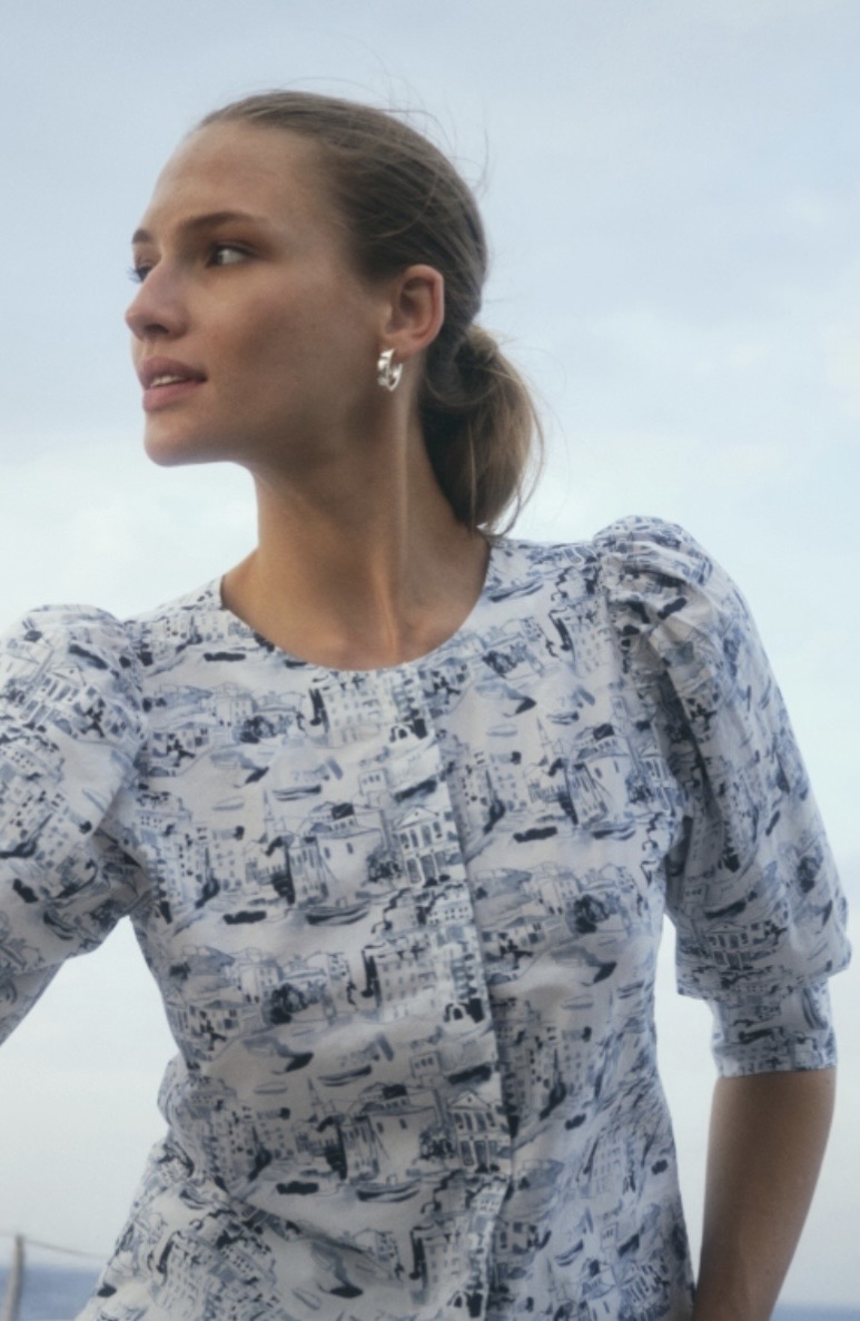 Vit bommullsblus med blått mönster, kort puffig ärm med reglerbar manschett.
