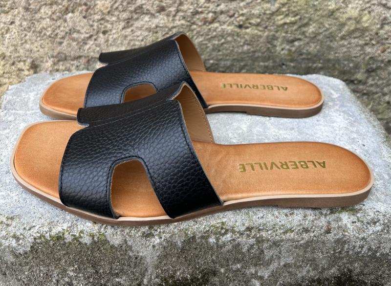 Svart slip-in sandal i skinn med brun sula, präglat skinn på ovandelen.