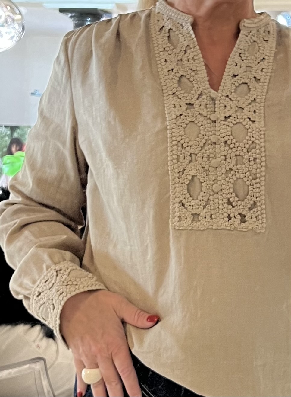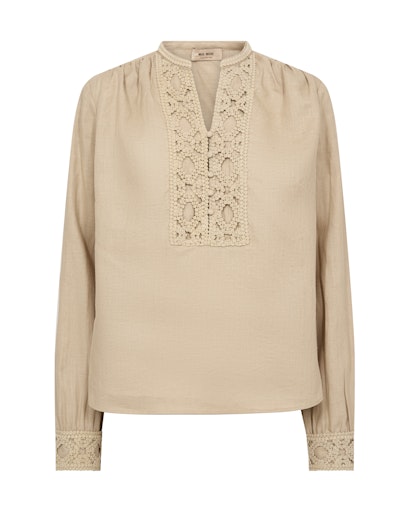 Khakifärgad blus i linneblandning med virkad spets fram på bröstet och på manschetterna.