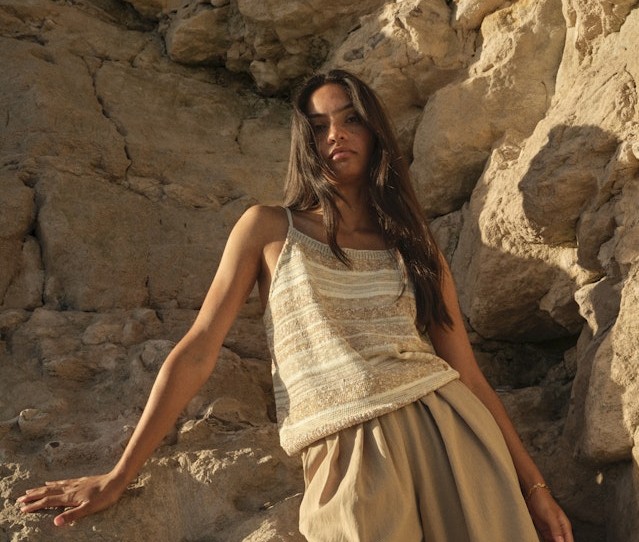 Stickat linne i olika beige toner, smala axelband.