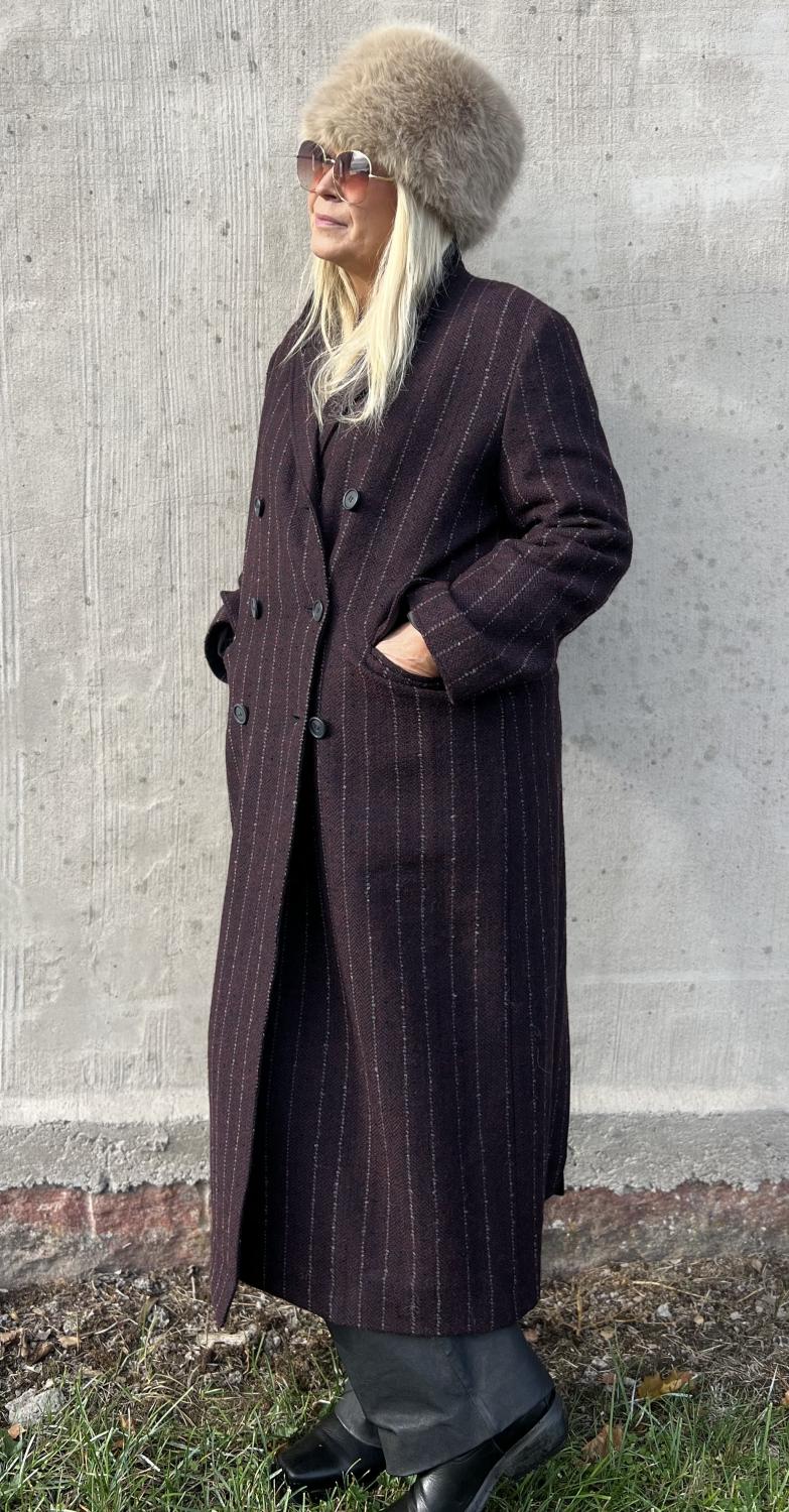 Vinröd ankellång kappa med ljusa kritstrecksränder, dubbelknäppt med två fickor fram med stora ficklock.