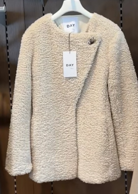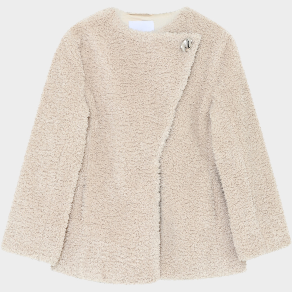 Krämfärgad teddyjacka med asymmetrisk knäppning med hakar.