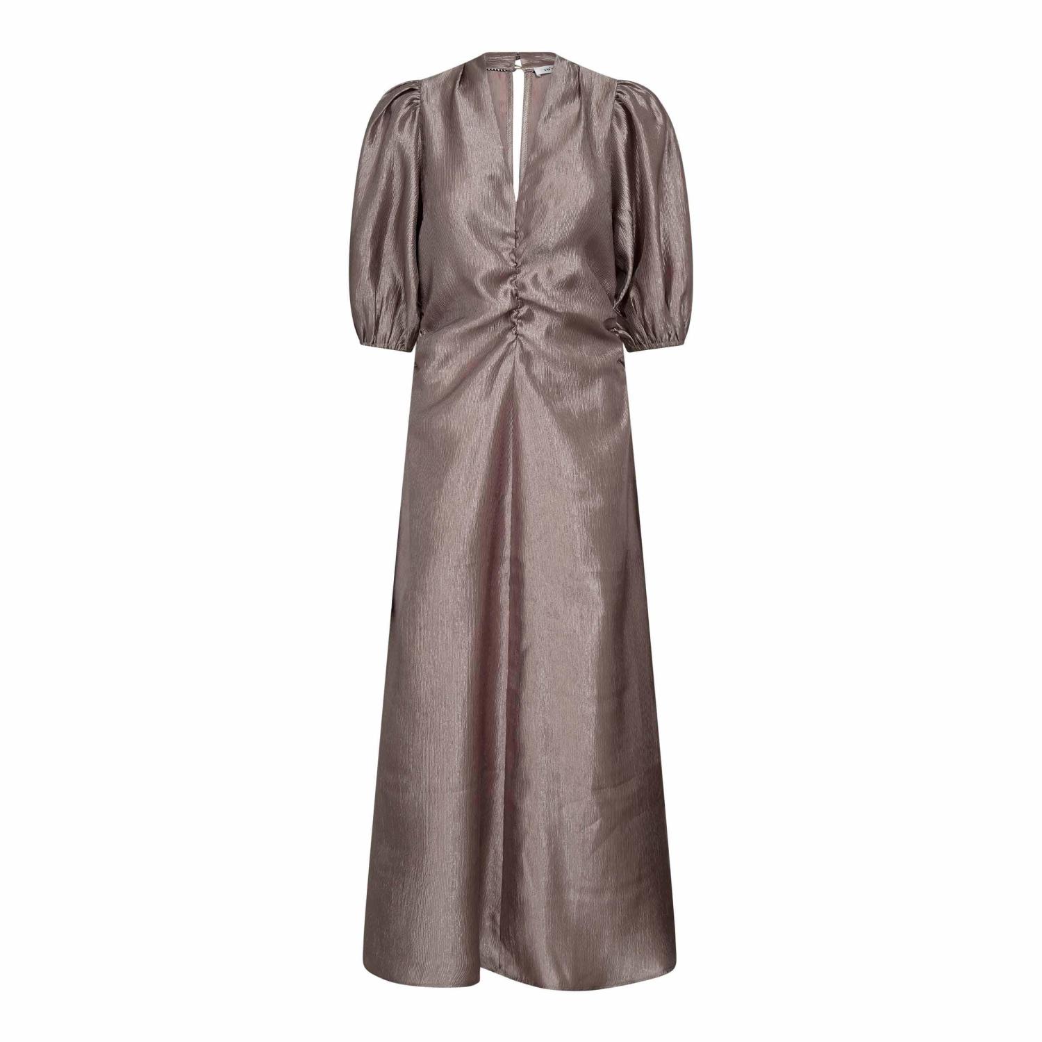 Hellång nougatfärgad klänning i glansigt material med drapering vid livet.
