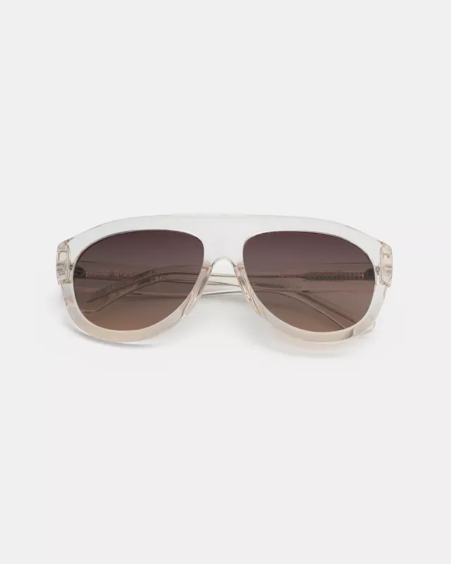 Transparenta solglasögon med en nytolkning av aviatorstilen, en markant och skulptural båge.