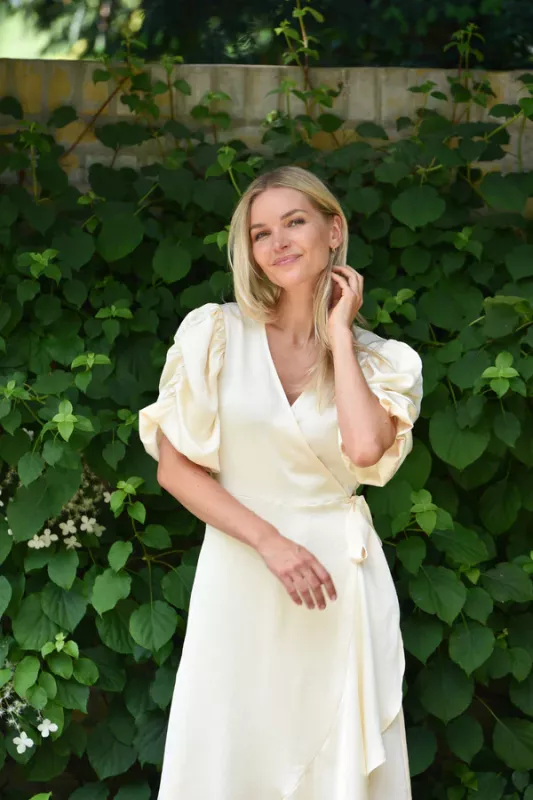 Ljusgul omlottklänning i glansigt tyg med krinklad struktur.
