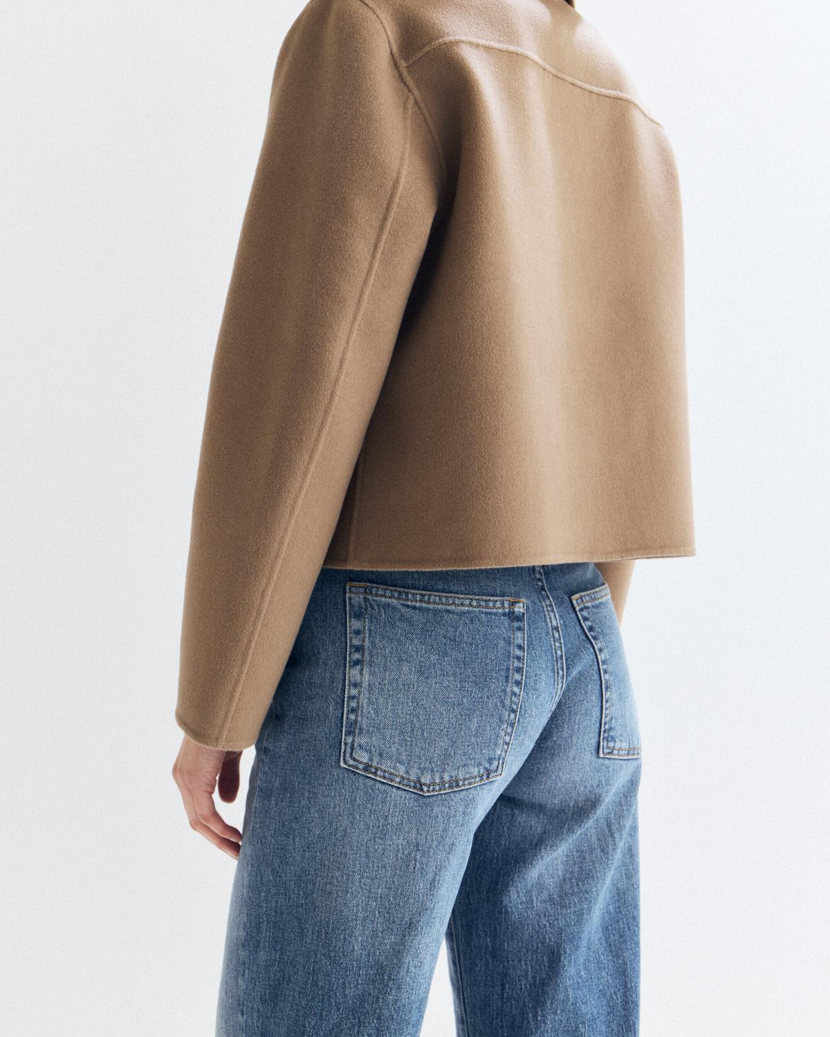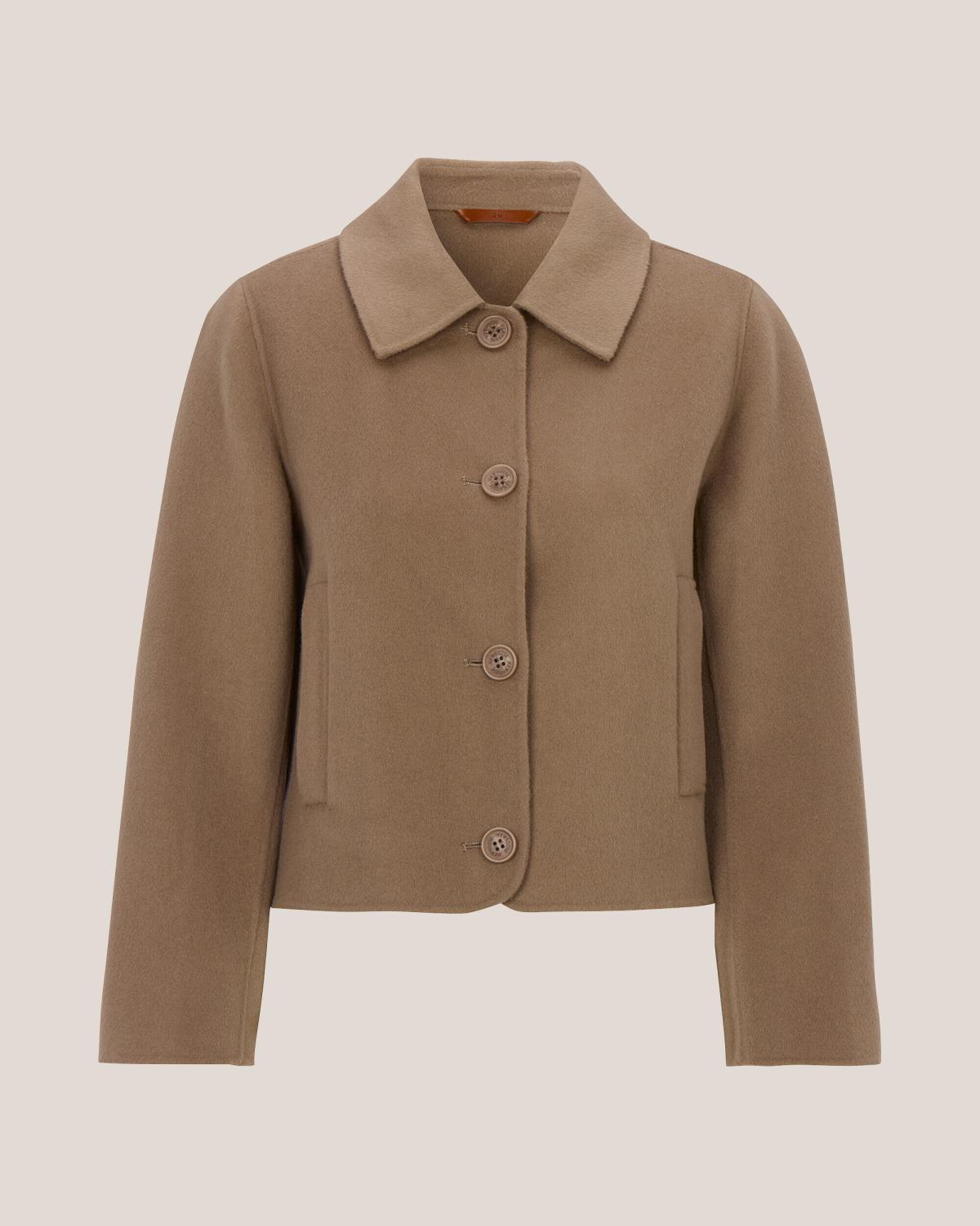Ljusbrun kort jacka i dubbelvävt ulltyg med krage och sidfickor.