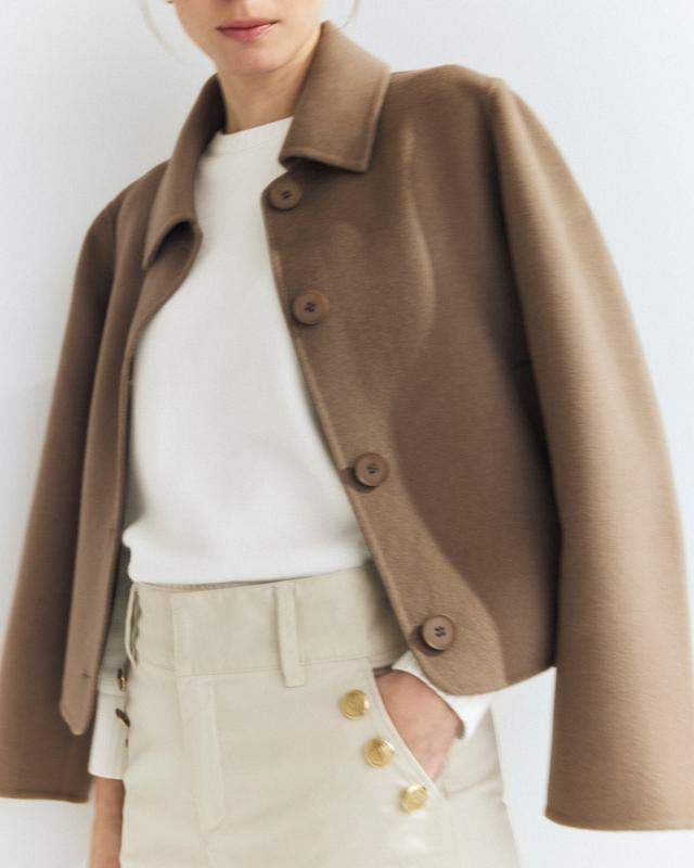 Ljusbrun kort jacka i dubbelvävt ulltyg med krage och sidfickor, ton i ton knappar fram.