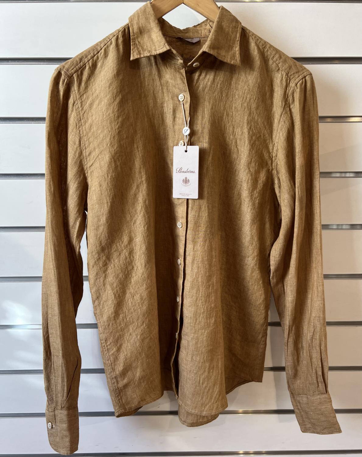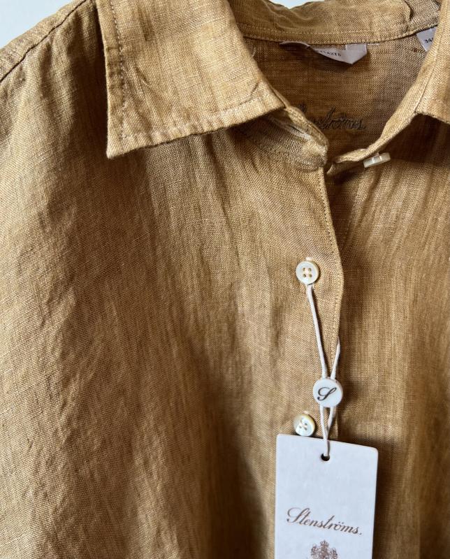 Kamelfärgad linneskjorta med krämfärgade pärlemoknappar.