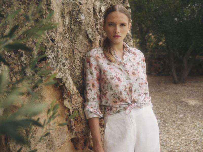 Blommig linneskjorta med offwhite botten och mönster i rosa, brunt och grönt.