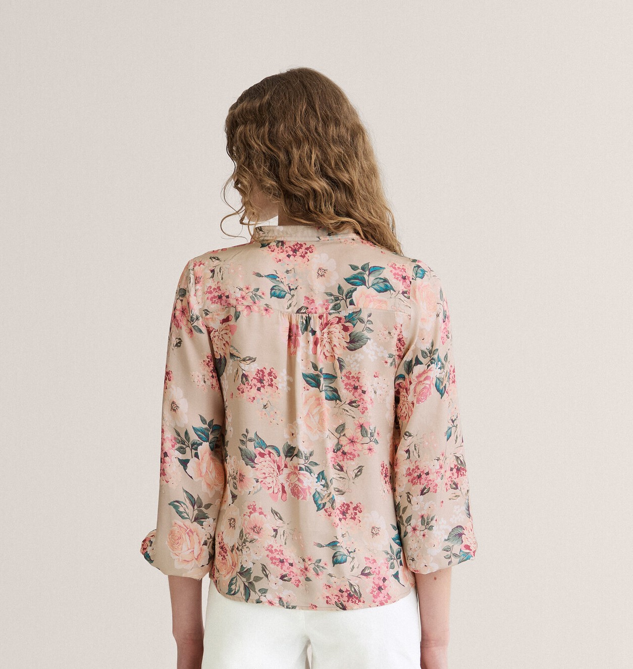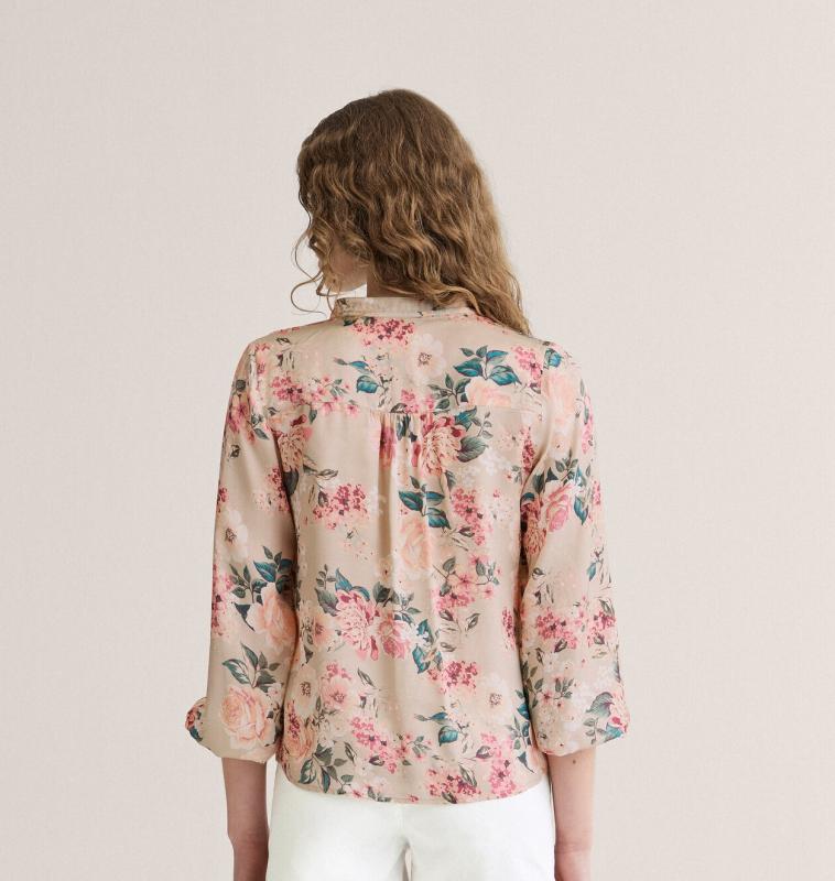 Blus i avslappnad passform med khakifärgad botten och blommigt mönster i rosa, grönt och beige.