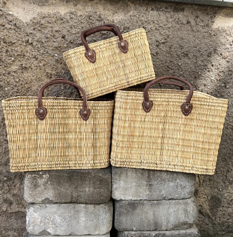 Bastväska med bruna skinnhandtag (finns i tre olika storlekar).