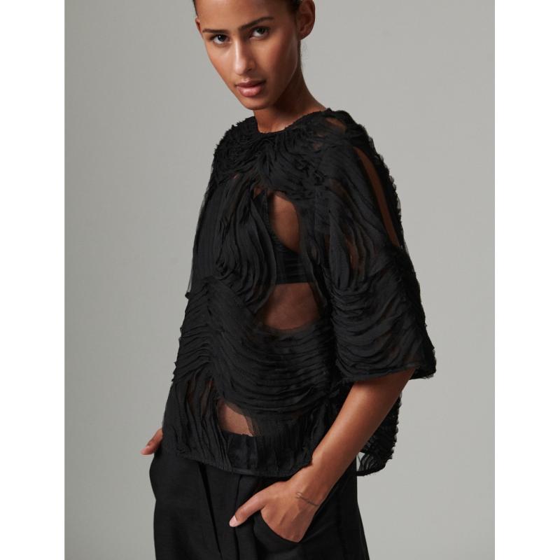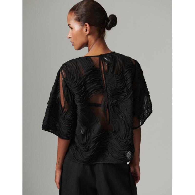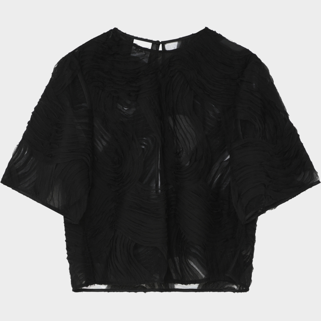 Svart genombruten blus med kortärm och abstrakt mönster.