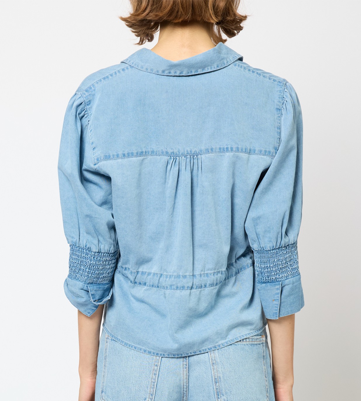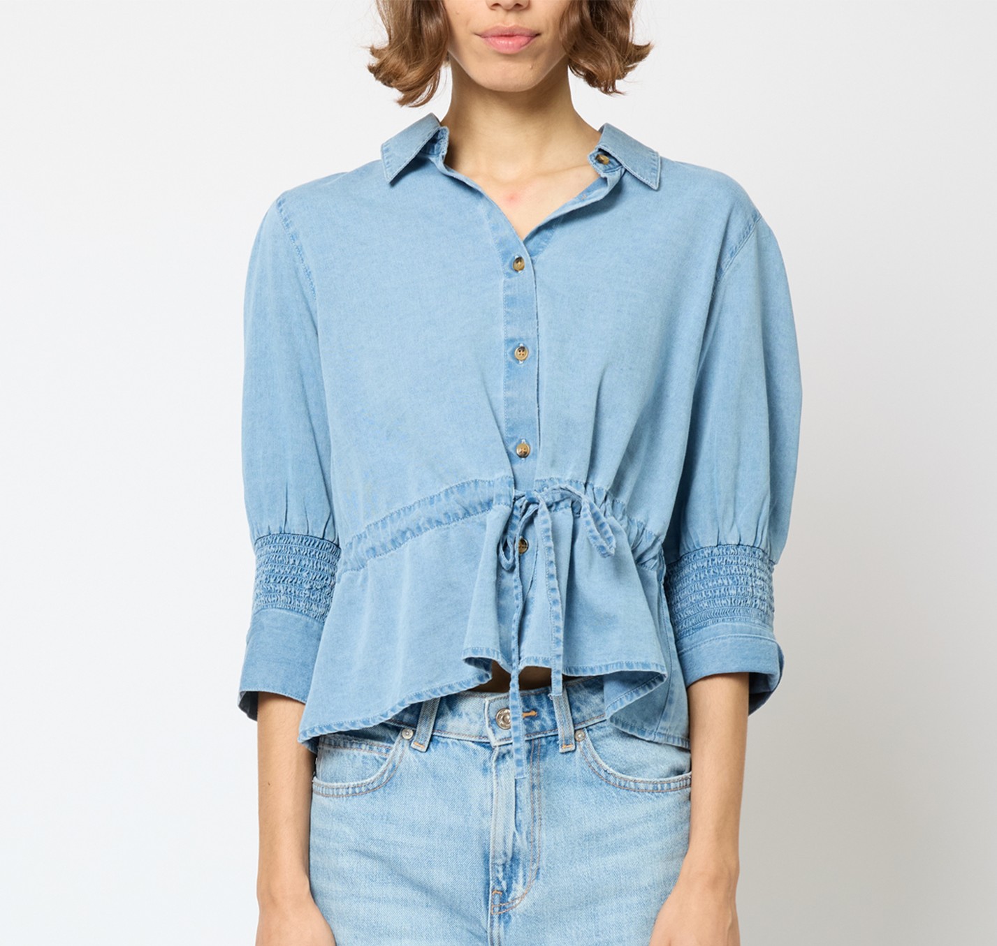 Tunn mjuk jeansskjorta med dragsko i midjan och med 3/4 ärm som avslutas med en resårsmock.