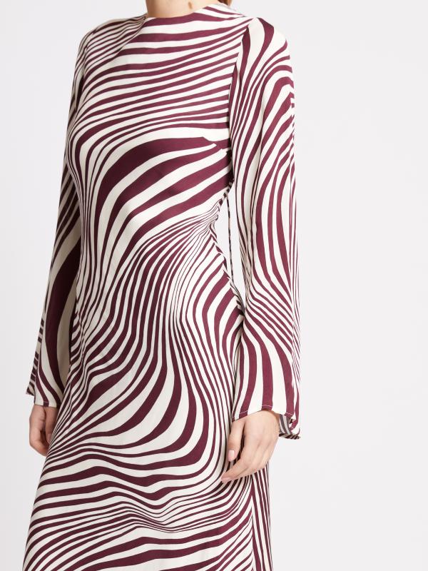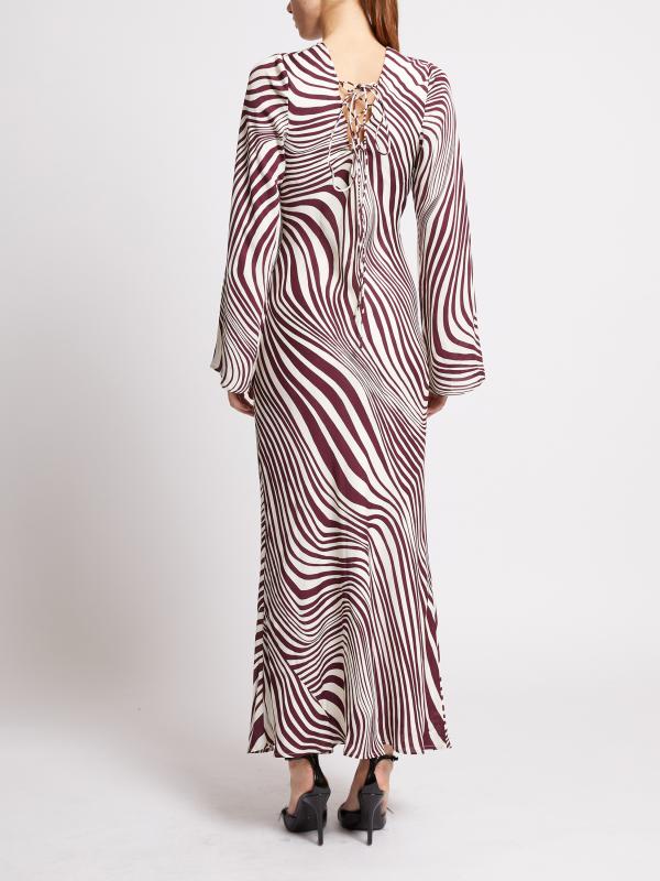 Långklänning i randigt mönster i bordeaux/offwhite, v-ringad rygg med sicksack knyt.